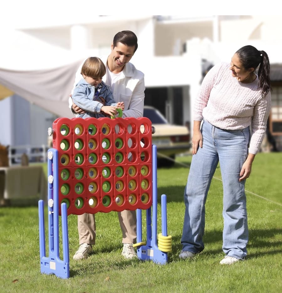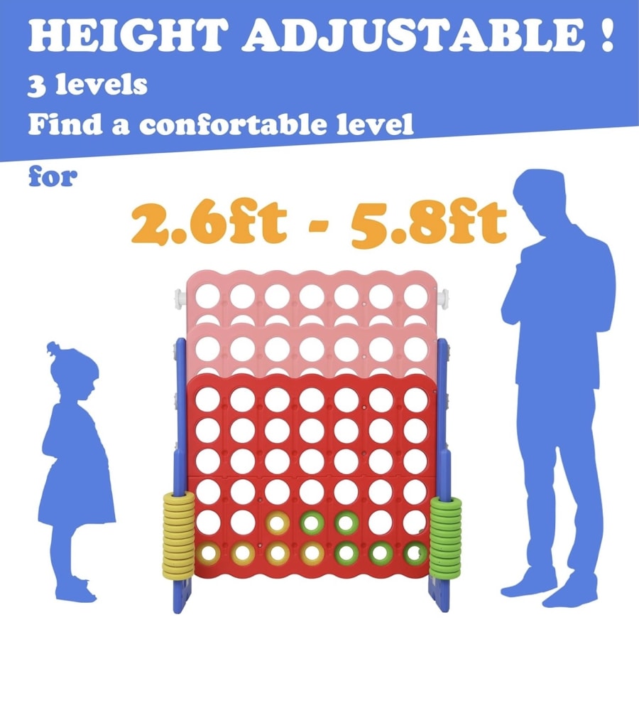 Who has the skills (and the luck) to prevail at Jumbo 4 In A Row? This giant, low-impact family favorite brings classic strategy to eye-level excitement. Fully adjustable from 2.6 feet to 5.8 feet, it’s the perfect match for toddlers reaching for victory, grandparents plotting their comeback, and teens pretending they’re not having fun. Slip the ring in the spot and the first to connect four becomes the PARTY STAR! 🌟